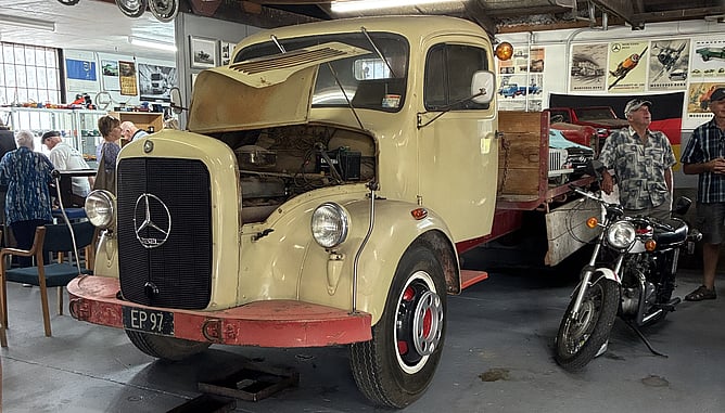 The Man Cave has every conceivable MB model, knick-knack, calendar, posters and old trucks, some fully restored and some in need of lots of TLC. Stuart gave us a wonderful dialogue of the history of all the various items on display and his intimate knowledge of current and long-gone truck models from the German manufacturer and his personal opinion of the way it is currently run here in NZ. That discussion could have gone long into the evening!